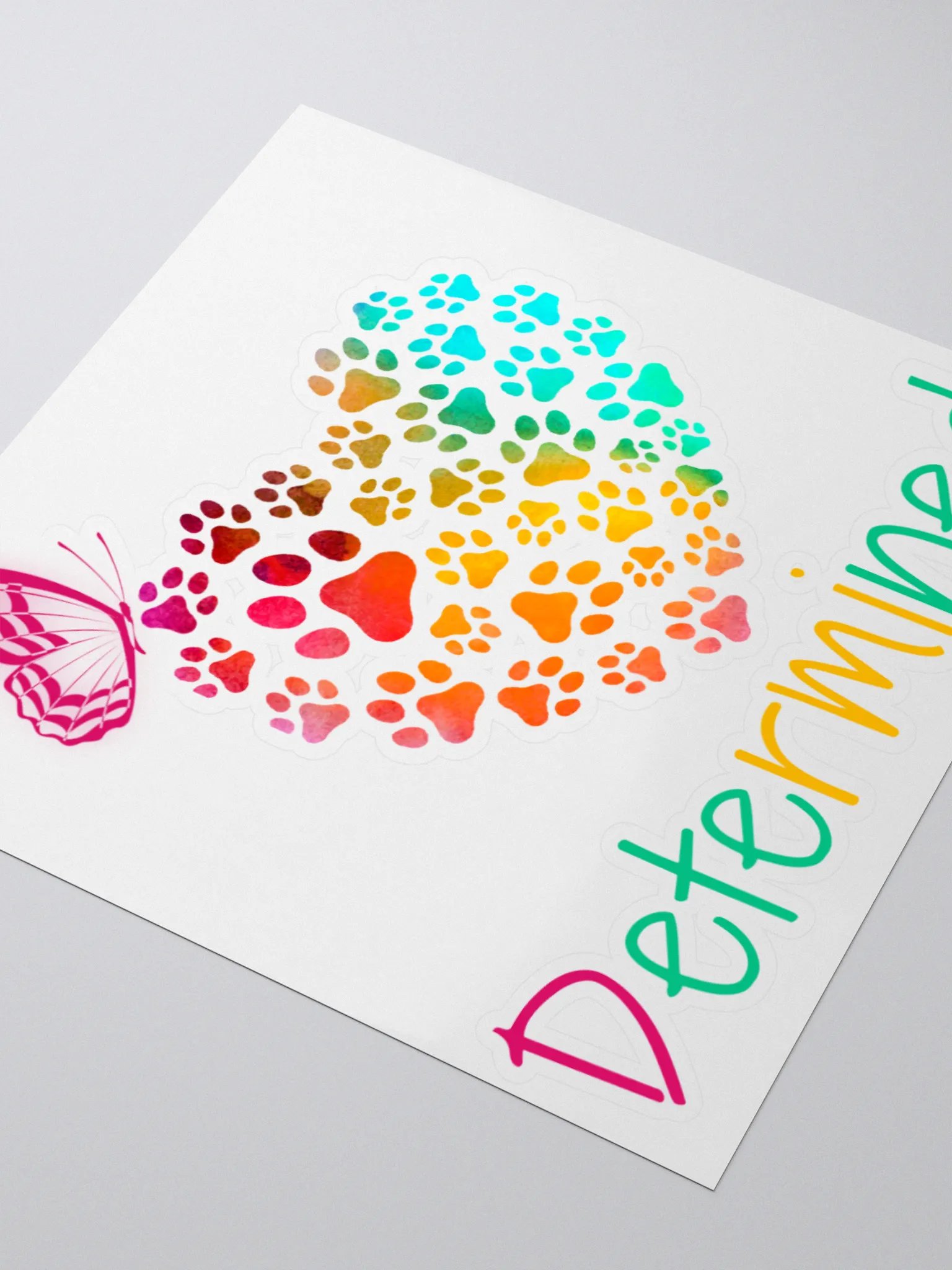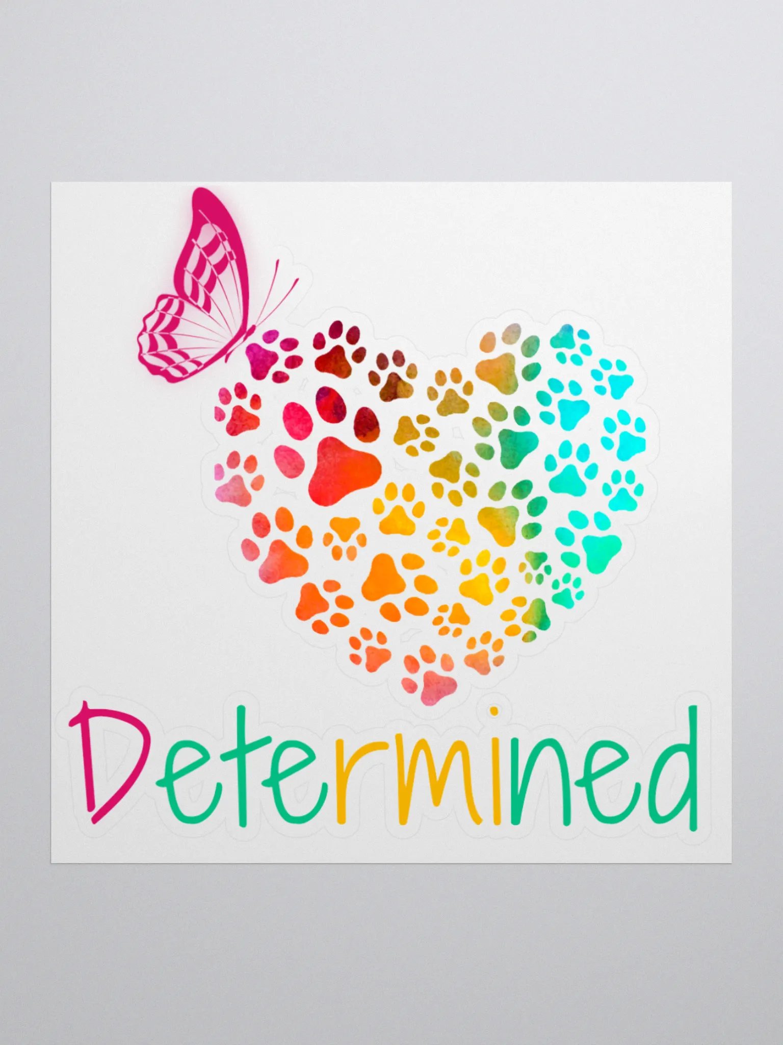 This "Determined" kiss-cut sticker is a perfect blend of inspiration and charm, featuring a heart made entirely of adorable puppy paw prints and a delicate butterfly. Whether you're adding it to your laptop, journal, or water bottle, this sticker serves as a reminder to stay focused and keep pushing forward. The combination of the paw prints and butterfly symbolizes the power of persistence and transformation, making it a motivational piece that's both cute and meaningful.