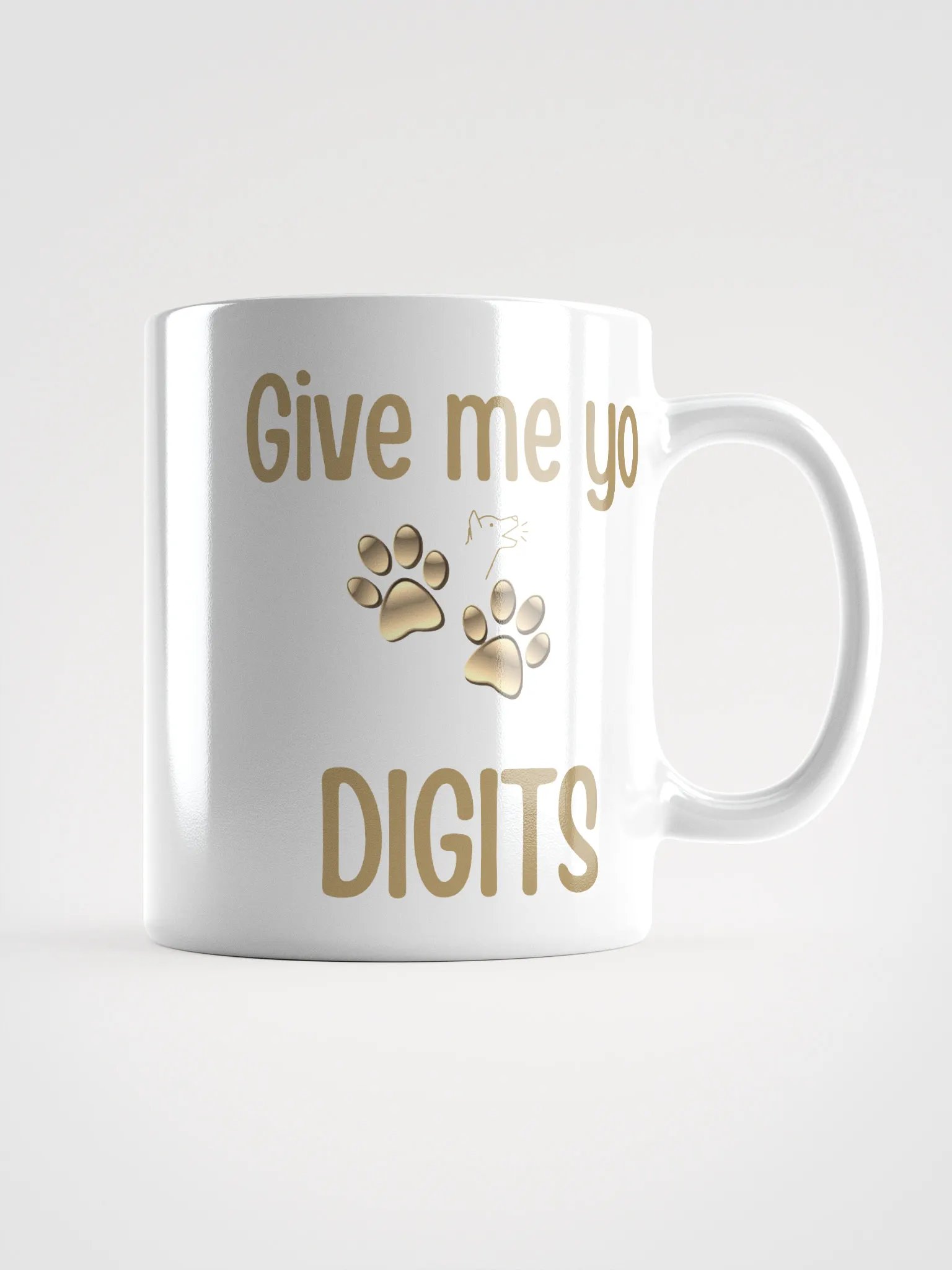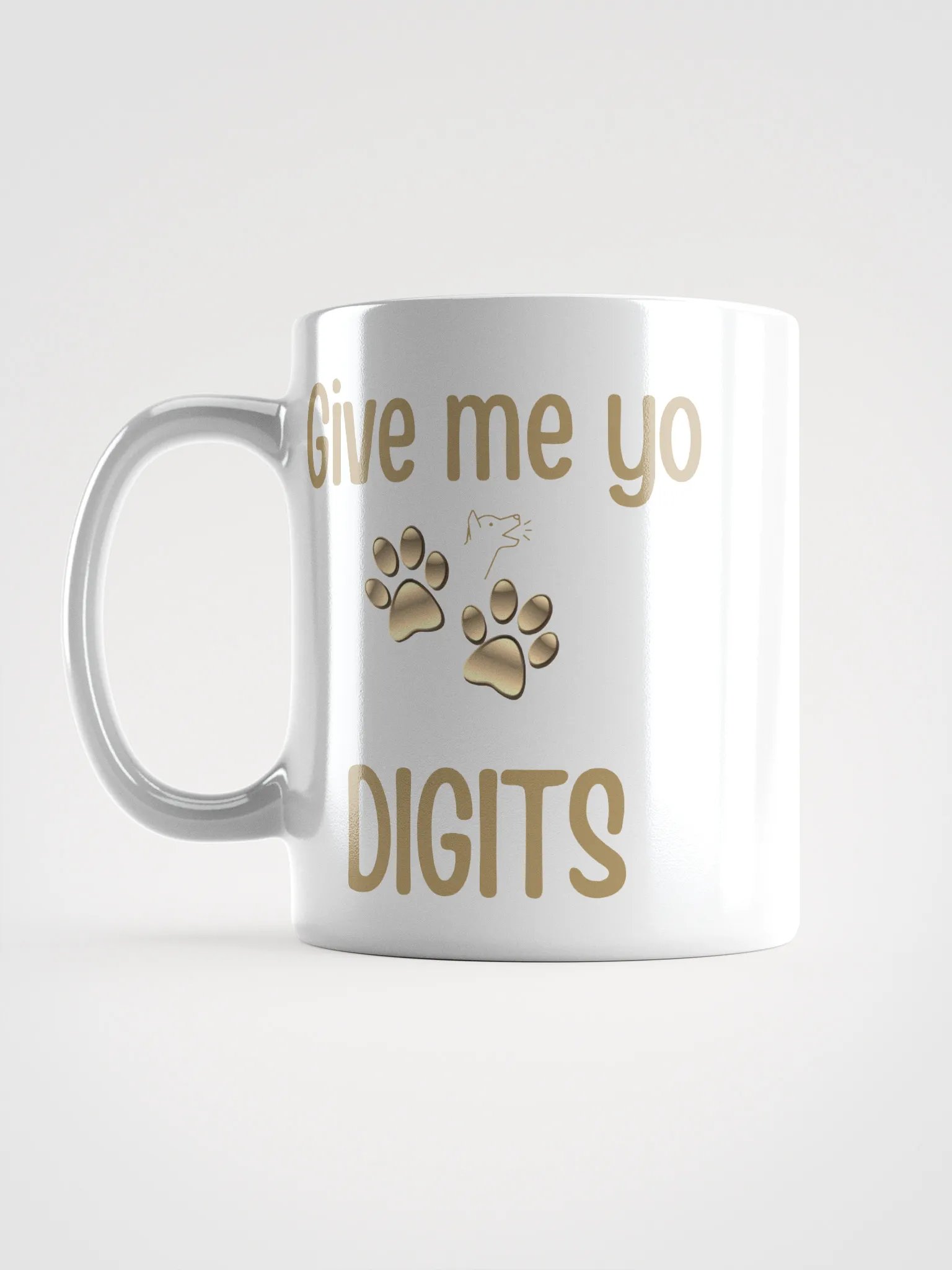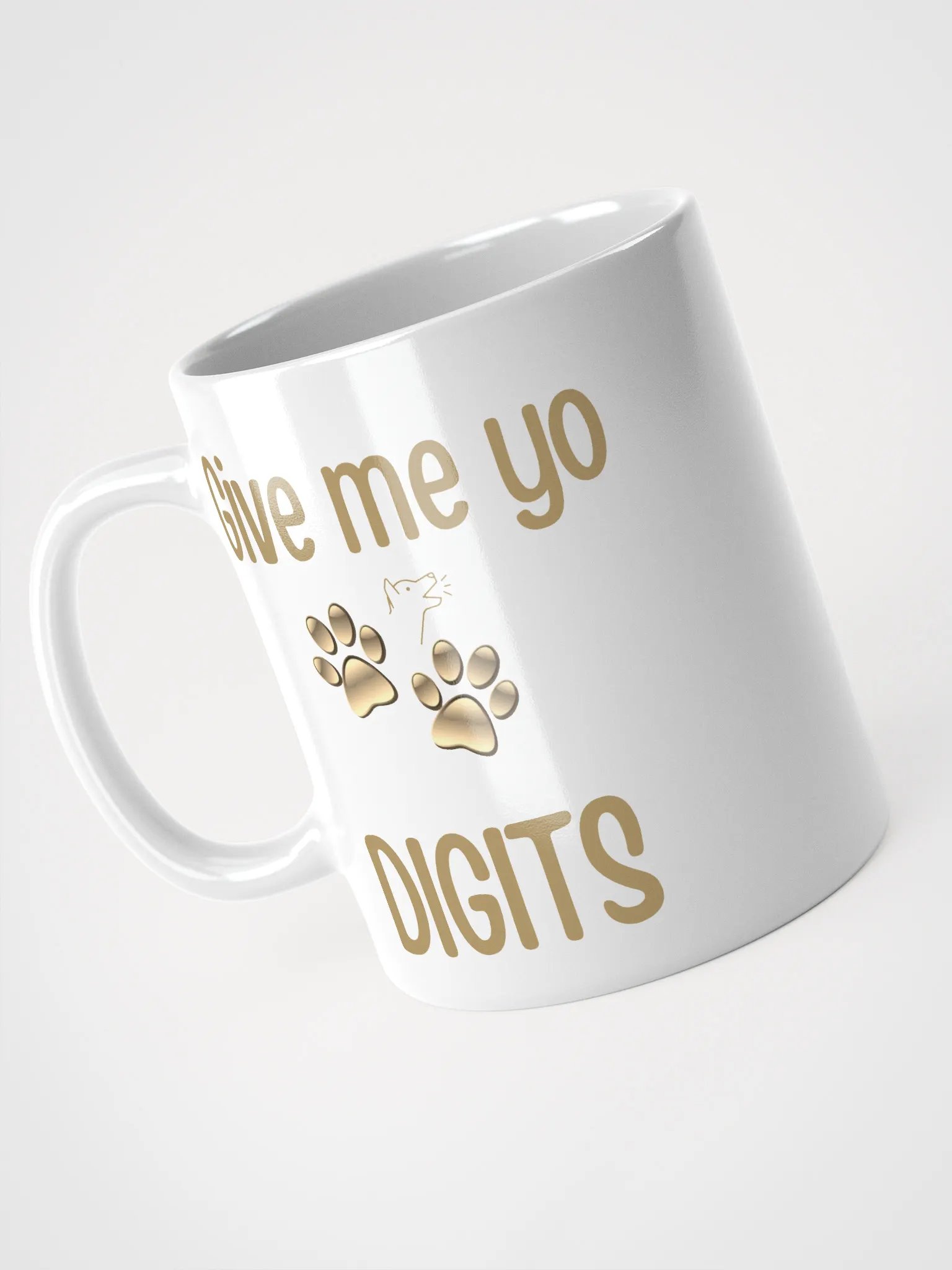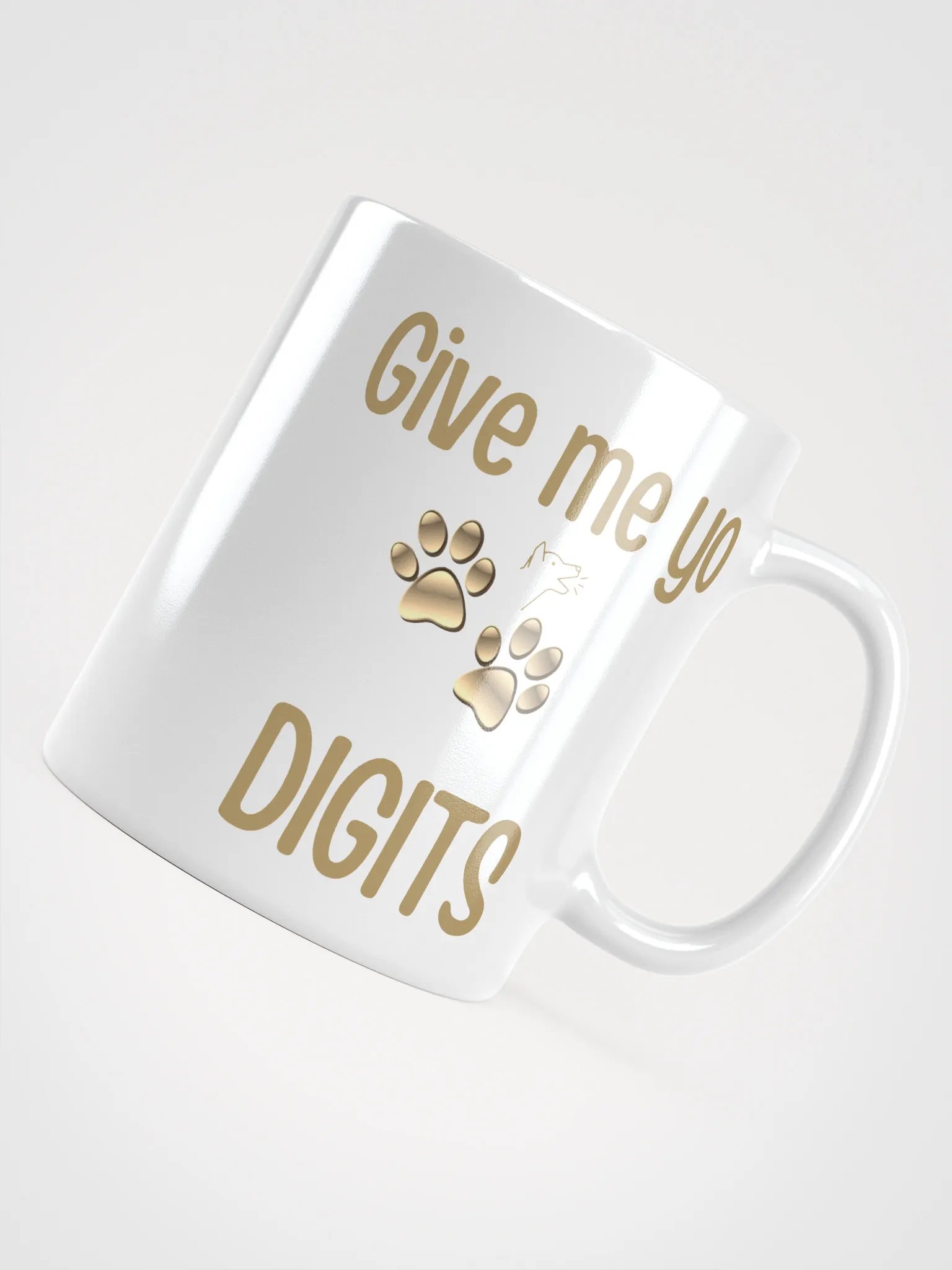 This fun glossy white mug is sure to bring a smile to your face with its playful design featuring puppy paw prints and the cheeky phrase "Give Me Yo Digits." It's a perfect gift for dog lovers who enjoy a good laugh with their coffee.